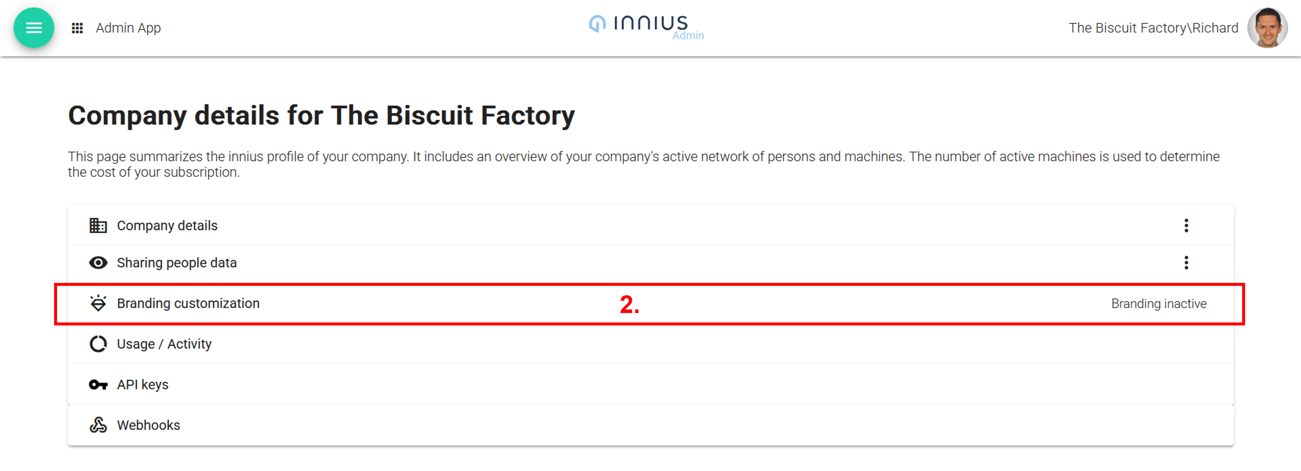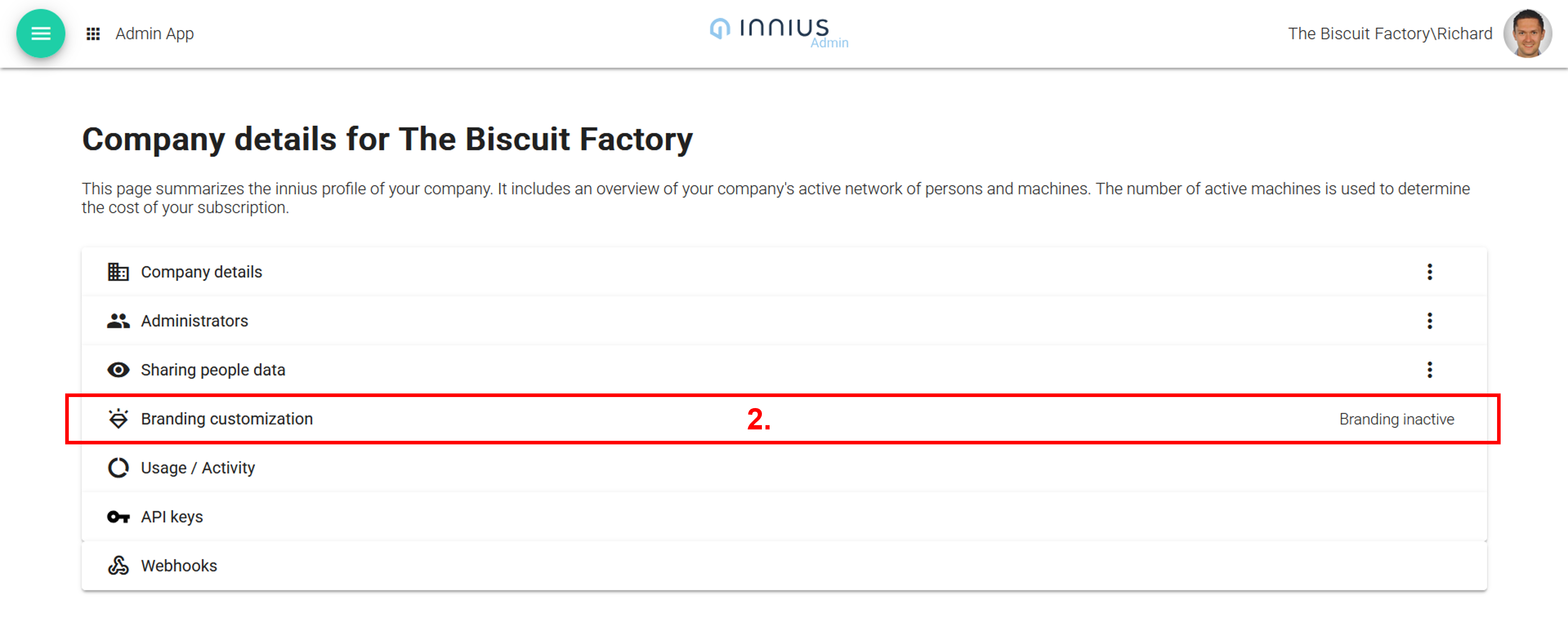 On the company page you will see the Brand Customization panel (2.). On the right hand side, you will see whether branding is active or inactive.
