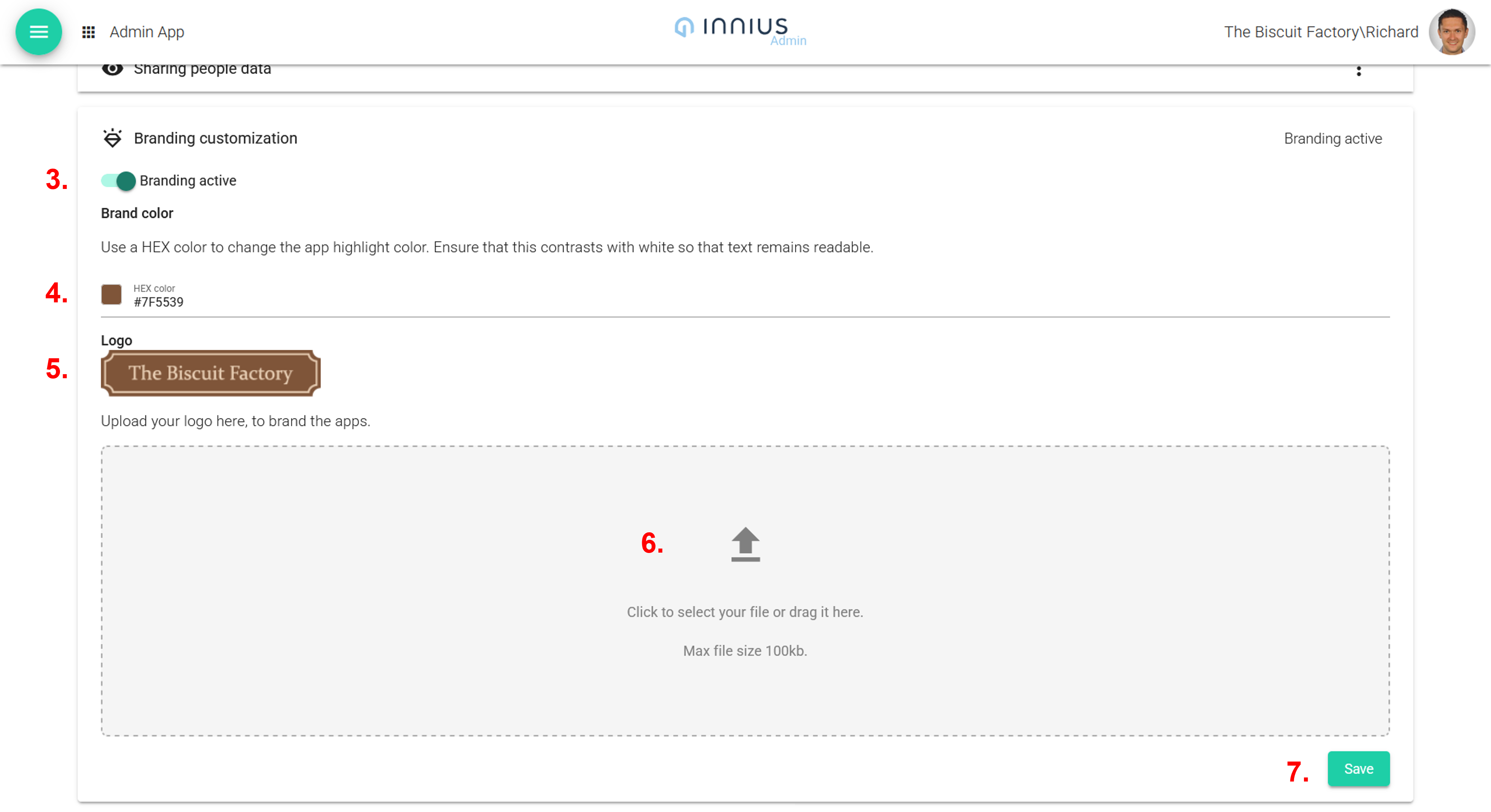 When you are finished click 'save' (7.). You will then get a confirmation message and will need to refresh the screen to see the new branding.
