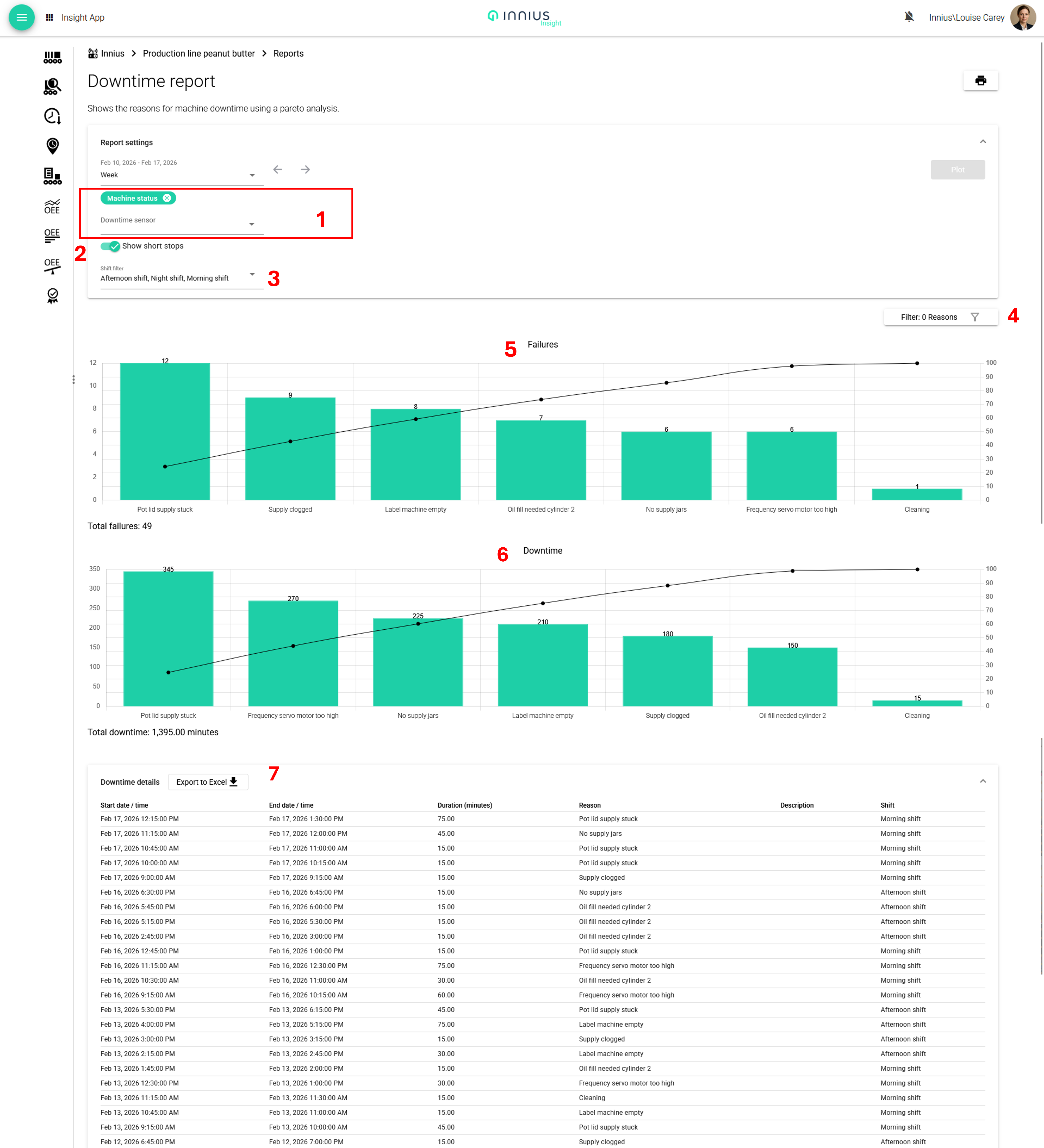 Once the data has been plotted, the Pareto analysis shows two charts. The top chart (5) sorts the downtime reasons, based on the number of occurrences . The chart below (6) sorts the downtime reasons, based on the total amount of downtime each has caused. The data can be filtered based on the reasons, using the filter menu (4).