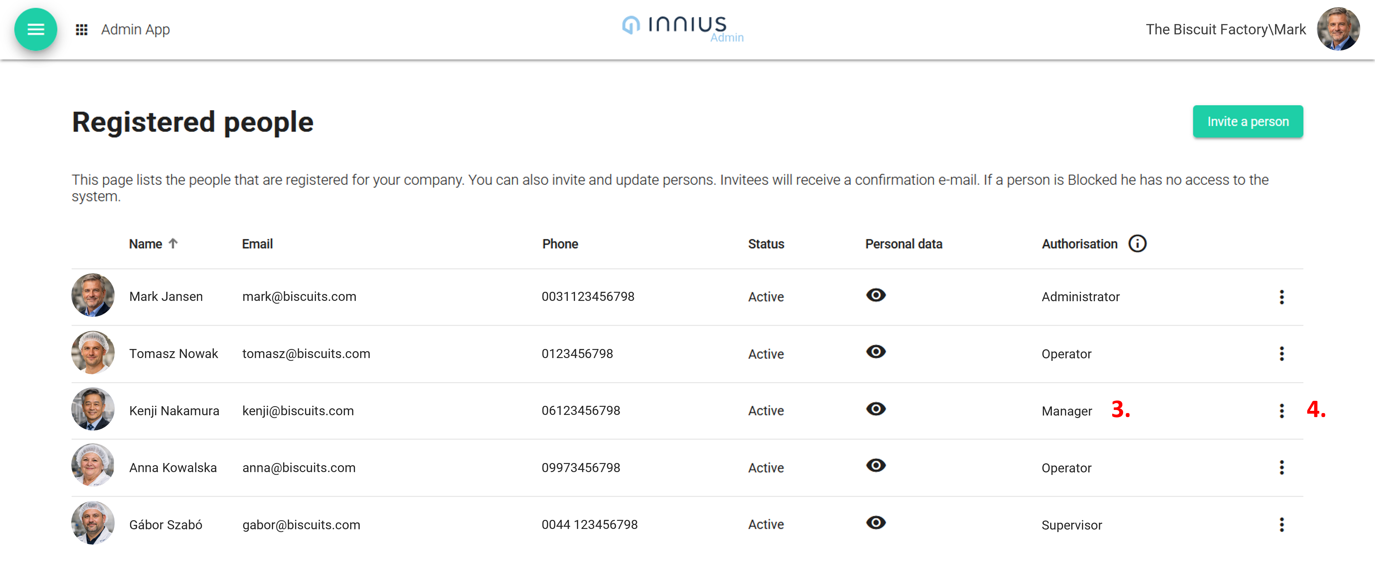 Here you will see the names of the users in your company, and their designated authorisation level (3). You can edit users, by clicking on the 3 dots button on the right of each user row (4).