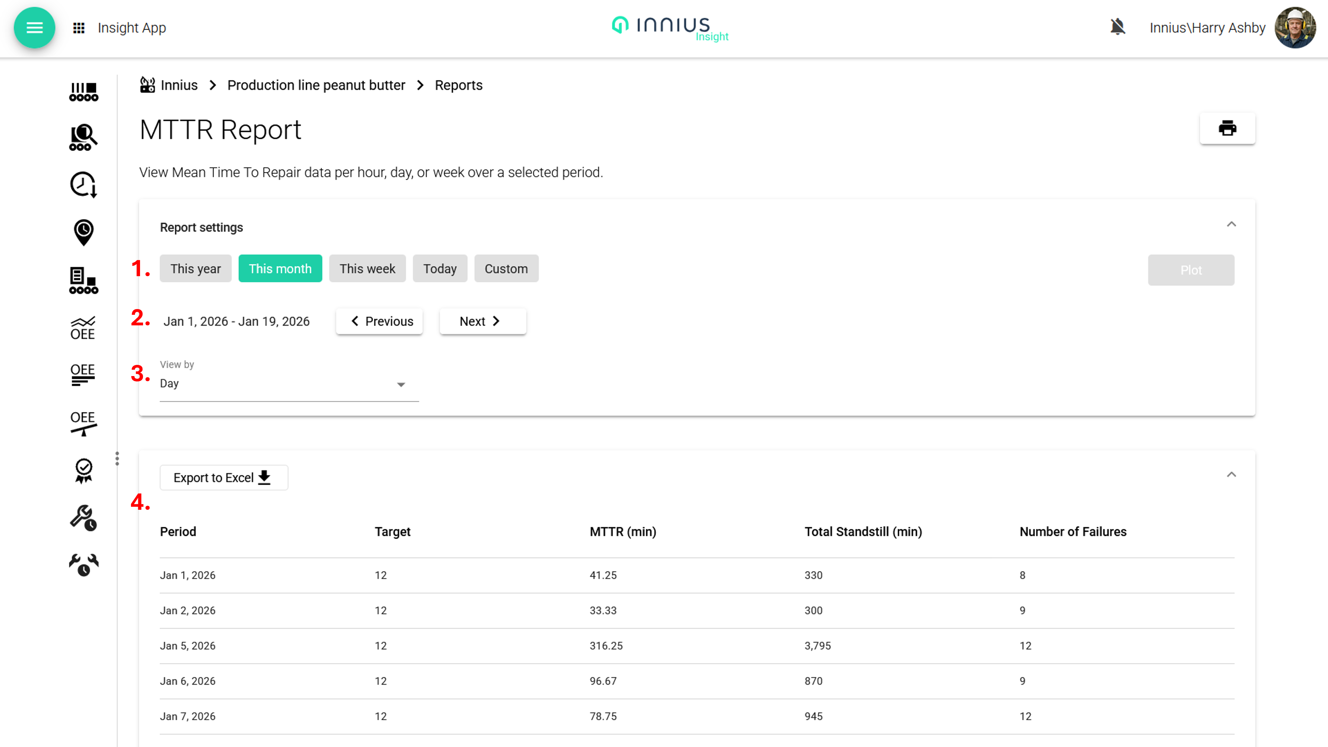 - The report will be generated in the form of a data table below (4.) This displays the period, the MTTR target, the MTTR value in minutes, the total standstill time in minutes, and the number of failures. This allows quick analysis and comparison of the MTTR behaviour. This data table can also be downloaded as an Excel file.